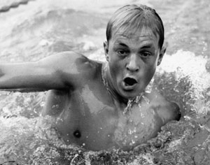 Schwimmen lernte er mit seinen sportlichen Eltern im Rhein als 8jähriger. Mit 14 kam er zum DSW. Seine Mutter war der Meinung, dass Schwimmen gut ist für sein Rückgrat. Und das war gut für sein ganzes Leben. Seine Begabung, sein Fleiß und seine Disziplin fielen auf. Der Ungar Janos Satori trainierte damals den Verein. Schon 1958 war er als 15jähriger die Sensation bei den Süddeutschen Meisterschaften im Woog. Der Bub aus gutem Hause machte 1962 sein Abitur an der Georg- Büchner-Schule und ging dann zum Studium an die California Universität in Los Angeles. Er wollte Wirtschaftsingenieur werden. In Amerika war er Schwimmer für den Los Angeles AC und kraulte in den bedeutendsten Städten und Staaten der USA. 1963 kam er nach Darmstadt zurück und schrieb sich bei der Technischen Hochschule Darmstadt ein. Und er schwamm weiter. Die Studentenweltmeisterschaften in Brasilien und Weltrekordversuche in Japan bestimmten seinen weiteren Weg. Ihm blieb wenig freie Zeit. Hörsaal und Schwimmbecken füllten die Tage aus. Im „Darmstädter Echo“ habe ich unter dem 26.05.1964 eine ganze Seite voll Begeisterung über ihn gefunden, da hat er einen Weltrekord über 200 m Kraul aufgestellt: 1:58,2 Minuten. Sein selbstbewusster Kommentar dazu: „Ich wollte den Zweiflern zeigen, dass ich unter zwei Minuten kraulen kann. Dass dabei der Weltrekord fiel, umso schöner.“ Der Sportberichterstatter des Darmstädter Echo, Karl J. Richter, schrieb u.a. über ihn: „Es liegt im Metier des Sportjournalisten, dass er die Wege international bekannter Spitzensportler kreuzt. Mir ist dabei selten ein Rekordmann und Weltklassesportler begegnet, der so natürlich, so wohlerzogen, so zurückhaltend und doch aufgeschlossen ist wie Hans-Joachim Klein.“